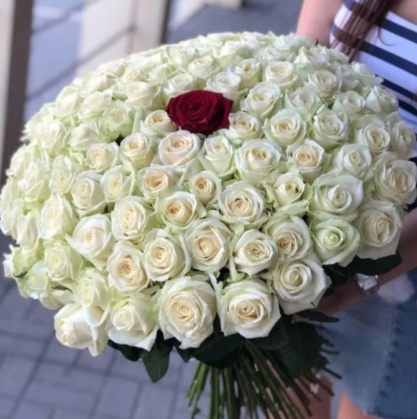Большой букет 100 белых роз и 1 красная роза в центре